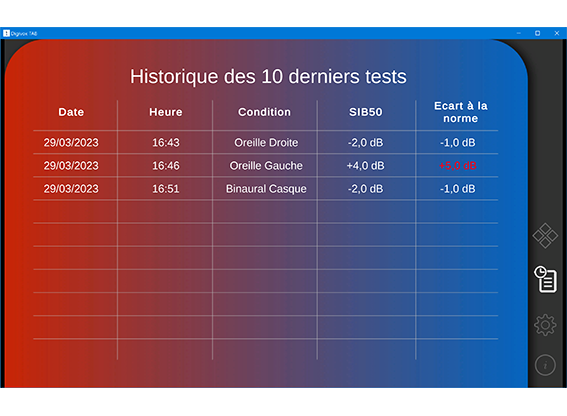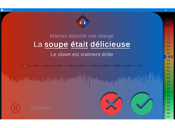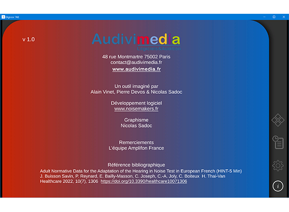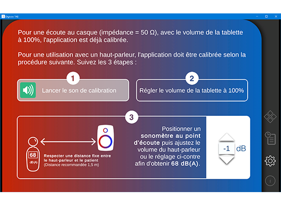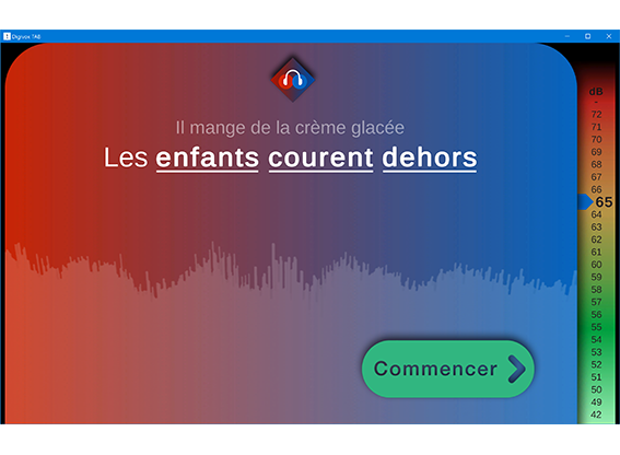 A very thorough and ergonomic software, Digivox performs vocal audiometry evaluations with or without background noise, from stereo to a 7.1 card. Digivox contains all the lists approved by the National College of Audioprosthetics and strives to be the go-‐to tool for the performance of vocal audiometry evaluations. Small, simple and particularly complete!