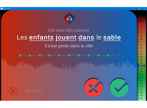 • It is recommended to carry out the evaluation in a binaural situation (headphones or in frontal free field / 1m) for more ecology. • In a free field, voice and noise are “mixed” in the same loudspeaker. In addition to the clinical evaluation intended to target a difficulty in discrimination in noise, this configuration makes it possible to measure a prosthetic gain after fitting by evaluating the adjustment (audibility, gain, time constants, dynamics, balance, etc.) and not the presence or the effectiveness of a directional microphone system. Testing on a single front loudspeaker located 1 m from the patient is more difficult for the patient (voice and noise mixed) but allows reproducible implementation of the test with a fixed standard. The addition of one/several loudspeaker(s) spatializes the situation and makes standardization dependent on the installation. • Noise is presented at a fixed level, only the level of the speech signal varies during the test, depending on the patient's responses. If the answer is correct, the level is reduced by 3 dB for the next item, if the answer is incorrect, the level is increased by 3 dB for the next item. Only the first item tested is followed by a 6 dB fluctuation depending on the quality of the patient's response. • The first 5 sentences are presented at a fixed level and at a very favorable signal-to-noise ratio (SNR) to allow o Patient task training o Hearing aids to detect the presence of noise and measure a more realistic result